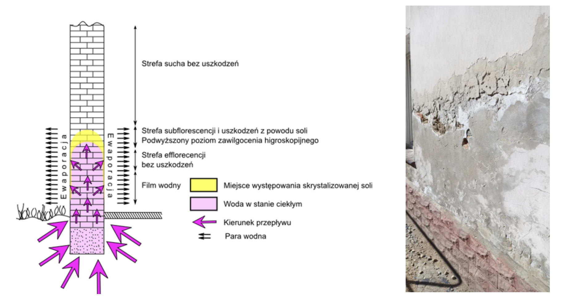 Zawilgocenie którego przyczyną jest podciąganie kapilarne wilgoci z gruntu charakteryzuje się występowaniem dynamicznej równowagi między napływającą z gruntu wodą a parowaniem. Występowanie tego zjawiska przez dłuższy czas prowadzi do gromadzenia się związków soli w miejscach odparowania wody. Pojawiające się kryształy soli w czasie swojego wzrostu wywierają nacisk na otoczenie w którym się znajdują, co prowadzi do odpadania tynków, łuszczenia farby, degradacji muru. W założeniach renowacyjnych określenie rodzaju zasolenie i jego klasyfikacja na stany niskie, średnie, wysokie umożliwia zastosowanie odpowiednich preparatów np. przekształcających sole rozpuszczalne w nierozpuszczalne oraz właściwy dobór cech tynków renowacyjnych wg WTA.